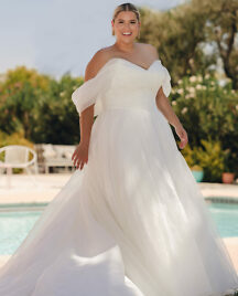 Dieses Brautkleid wurde in einer klassischen A- Linie geschnitten und aus edel glänzenden Satin gefertigt. Ausschnitt und Träger wurden im eleganten Carmen- Stil gehalten. Die kleine, zarte Applikation kann sowohl in schwarz als auch Ton- in- Ton bestellt werden.