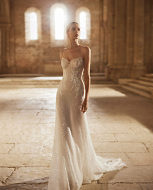 Dieses klassische Brautkleid ist in einer schlichten A- Linie geschnitten. Der Satinstoff wird durch romantische Stickereien am Dekolleté und am Rock aufgelockert. Das gerade Dekolleté wird trägerlos abgeschlossen. Eine kleine Schleppe rundet das Kleid ab.